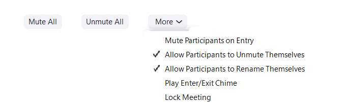 If you are presenting and don’t want others to interact, click Mute All. It’s helpful to **Mute Participants on Entry **in case they don’t remember to mute themselves.