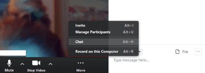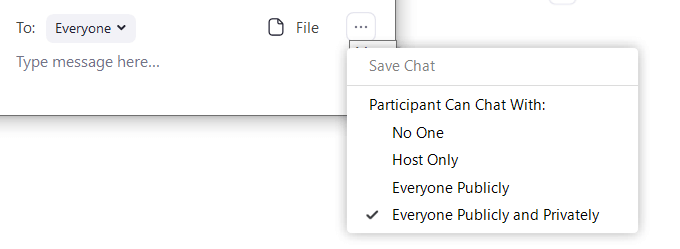This will enable all participants to chat and share files. If you don’t want everyone to be able to use the chat feature, click on the three dots next to File.