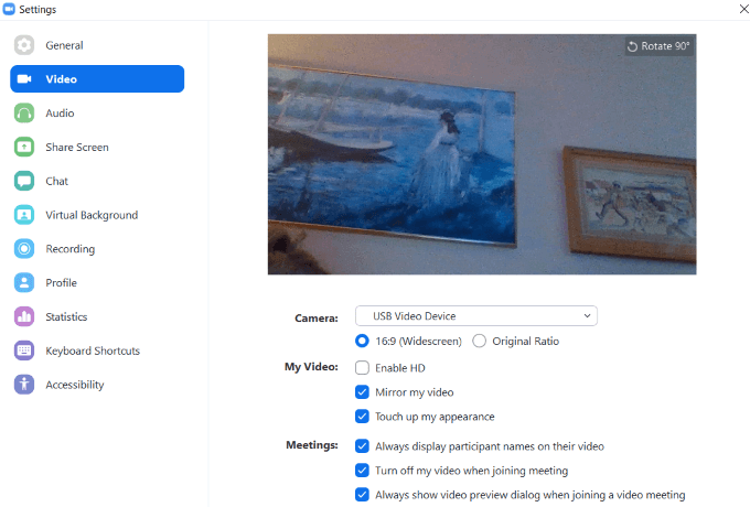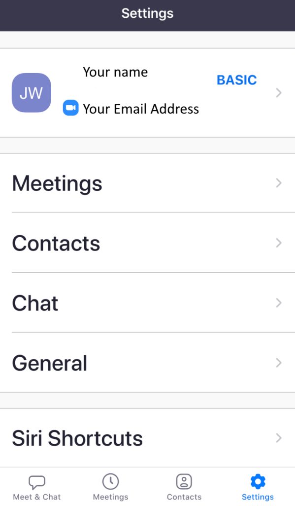 Use the Settings tab to make changes to your account. Zoom settings are organized by: