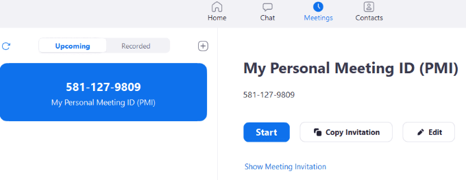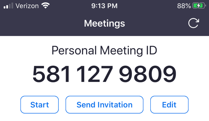The Meetings tab on the bottom bar will show any upcoming events and your Personal Meeting ID. From this screen, you can start a call, send an invitation, or edit an event.