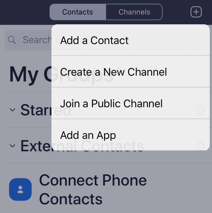 To add a contact, tap the plus symbol in the top right-hand corner. This will open a pop-up menu for you to add a new contact, join a public channel, or create a new channel.
