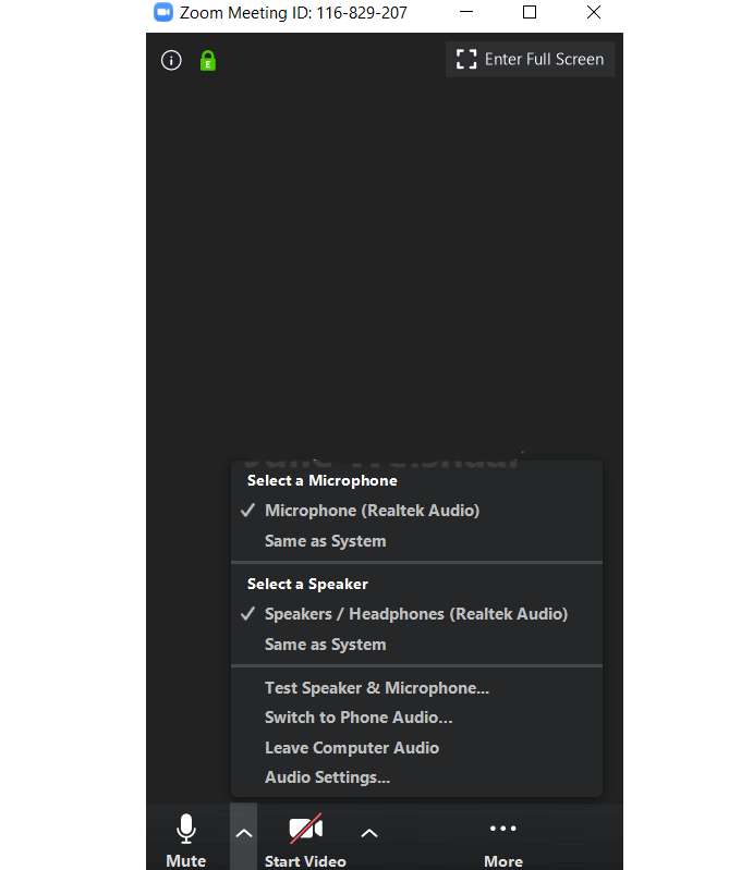 Note that stopping the video doesn’t end the meeting or stop the audio. There is also an up arrow next to Start Video and Stop Video where you can choose a camera, virtual background, and other video settings.