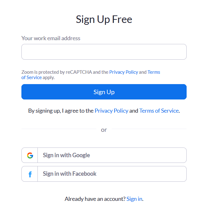 Start by going to the Zoom website, sign up, and open an account. You can set up your account with your email address or sign in with Google or Facebook.