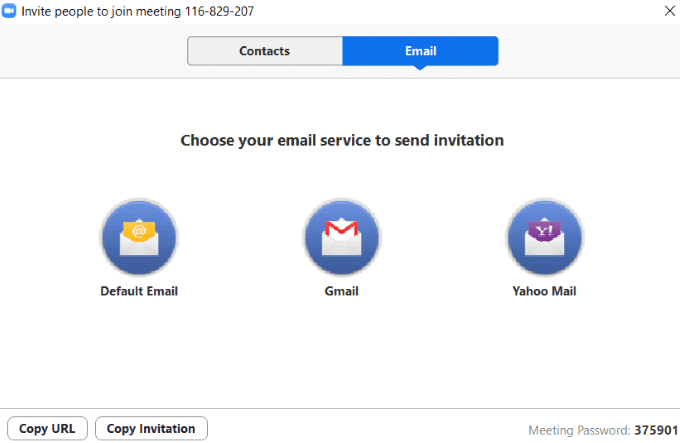 After you set up your audio and video, you can invite people to join your meeting. Click on **Invite. **You can use your contacts, email, or click Copy Link to get a URL to send manually.