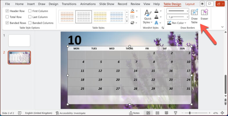 While a template is a time-saving way to insert a calendar in PowerPoint, it also has one disadvantage—it won’t match your existing slide style. If you can’t find a matching template but prefer to use a calendar in your presentation that fits your style, you’ll need to create one manually.