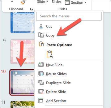 - Right-click the slide that contains the month you want to use and select Copy.