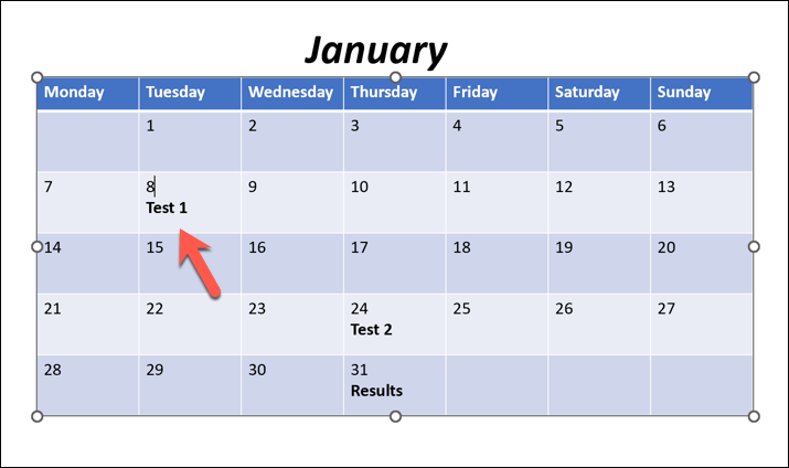- Next, fill in the table cells with the days of the week or month and any important dates or events you want to make clear to your audience. You can also format the table cells with additional colors, borders, and shading.