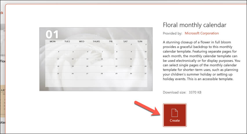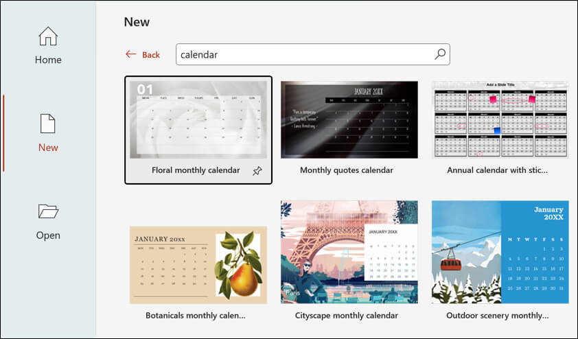 - Browse through the available templates and select the one you like the most. Alternatively, you can visit the Microsoft PowerPoint design template website, where there are other calendar templates you can download and use, or find free third-party PowerPoint templates online to use instead. * Once you’ve selected a template, press Create to open the template in a new presentation.