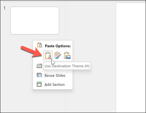 - Go back to your original presentation and right-click between the two slides where you want to place the copied slide, then select Use Destination Theme. This will apply some (but not all) of your PowerPoint theme to the slides, such as the font and formatting styles.
