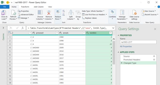If you select a column in this editor, you’ll see the assumed data type under the Transform section in the ribbon.