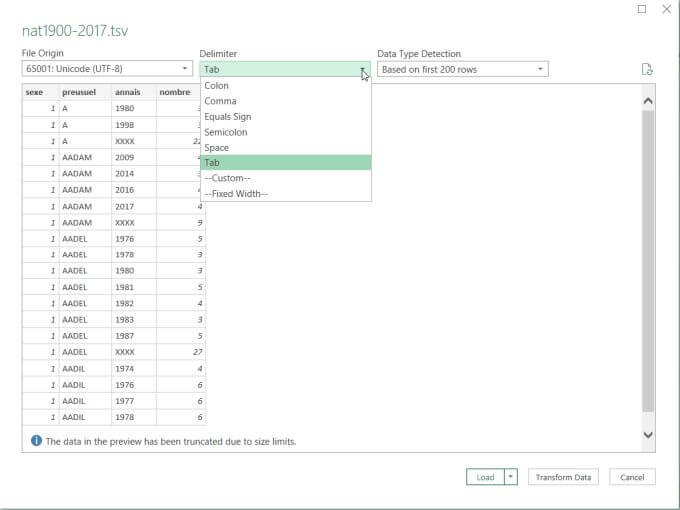 This will open the data import wizard. Excel analyzes the incoming data and sets all of the dropdown boxes according to the format of the input data file, based on the first 200 rows.
