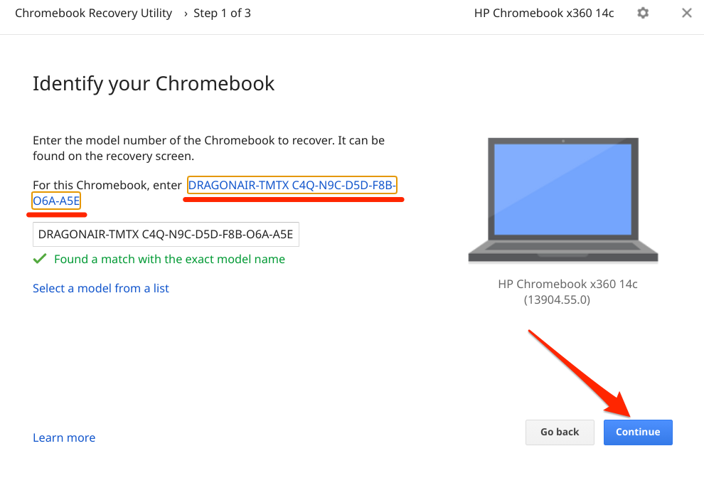 - The alphanumeric digit on the screen is your Chromebook’s model number. Enter the digits in the provided dialog box and select **Continue** to proceed.