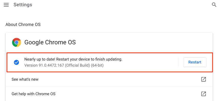 Additionally, installing this Linux environment on Chromebook requires Chrome OS 69 or later. Head to Settings > About Chrome OS to check the Chrome OS version or update your Chromebook’s operating system. Install any available update or restart your device to finish pending updates.