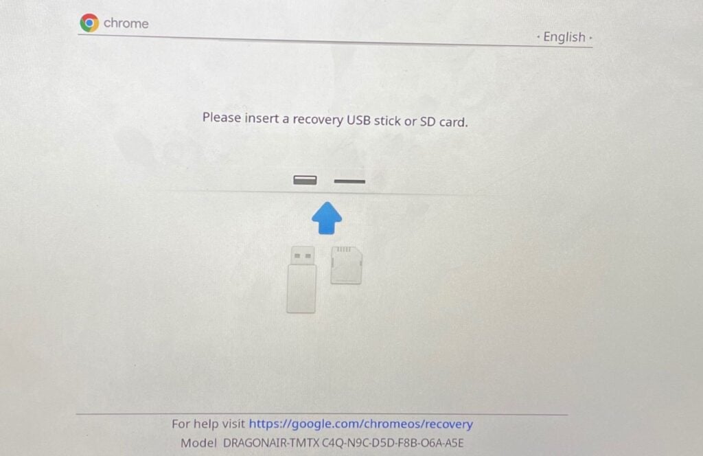 - Release the buttons when a recovery screen comes on the Chromebook’s display. * Ignore the “Please insert a recovery USB stick or SD card” instruction on the screen. Press **Ctrl** + **D** to activate Developer Mode.
