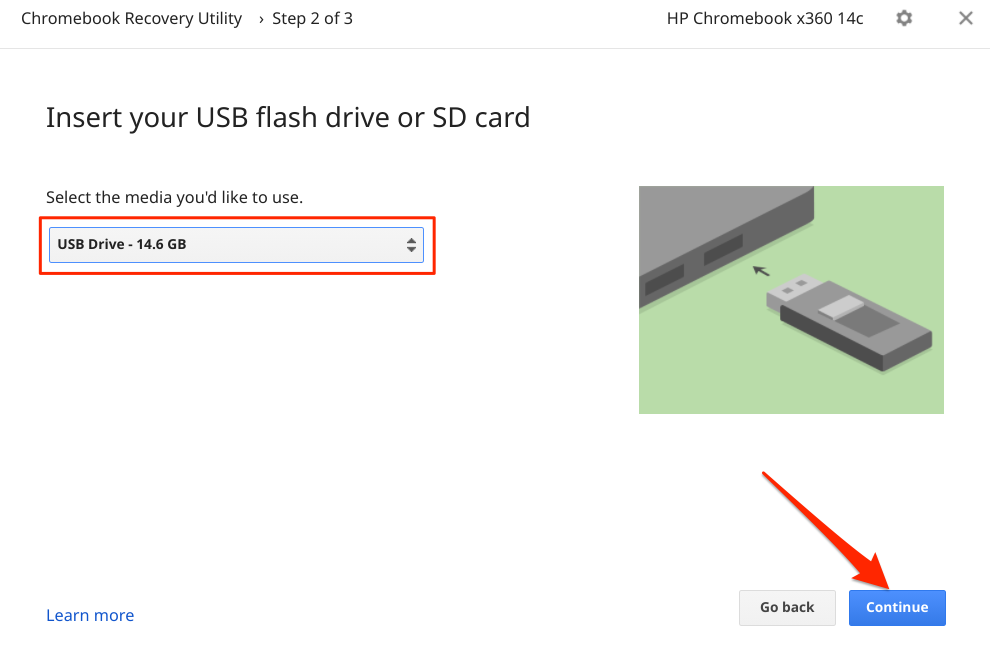 - Select the media device you’d like to use to create the recovery image and select **Continue**.