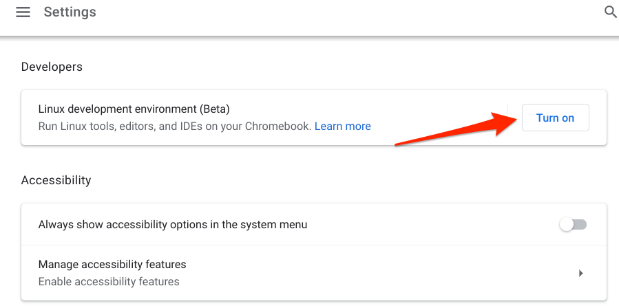 - * Launch the Settings app, expand the Advanced category, scroll to the Developers section, and select the Turn on button on the “Linux development environment (Beta)” row.