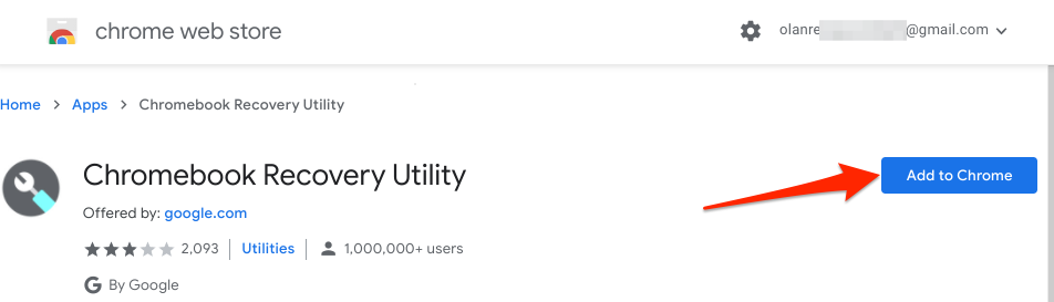 - Launch Chrome, head to the Chromebook Recovery Utility page on the Chrome web store, and select Add to Chrome.