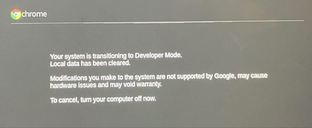 You’ll get an on-screen notification that your Chromebook is now transitioning into Developer Mode. Do not turn off your Chromebook during the process and make sure it holds enough battery power (50% or more).