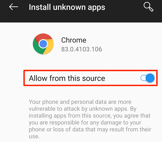 - Choose the app you’ll use to install APKs. In most cases, it’ll be either your browser or file manager. * Enable the **Allow from this source** option.
