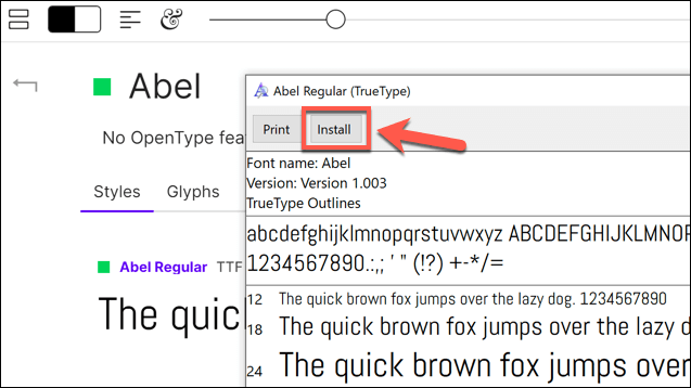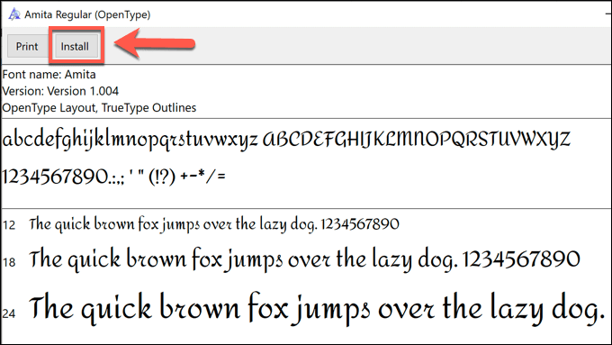 - Double-click the font file to open it in Windows Font Viewer. Once it opens, press the **Install** button.