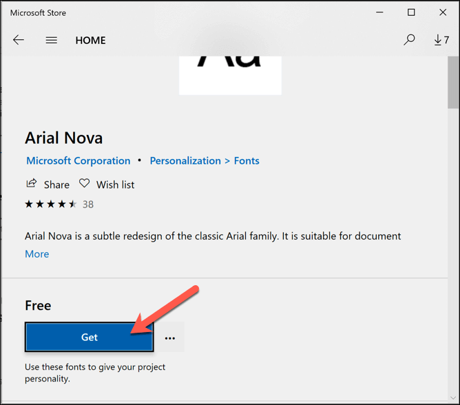 - In the preview section for a font in the Microsoft Store, press the **Get** button. This will download and install the font on your PC. You’ll need to authorize the purchase if you’re purchasing a paid-for font at the next stage.