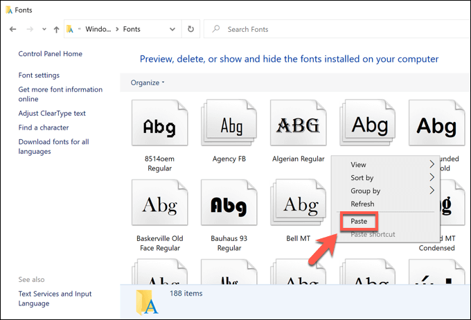 - To do this, open Windows File Explorer and head to the C:WindowsFonts folder. In another Explorer window, drag the files to the Fonts folder. Alternatively, copy the files, then **right-click > Paste **in the Fonts folder itself.