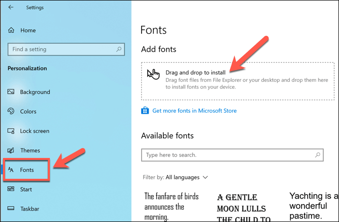 If you’re struggling to install fonts on Windows 10 that you’ve downloaded online using the method above, you can drag-and-drop them in the Fonts menu in **Windows Settings **instead.