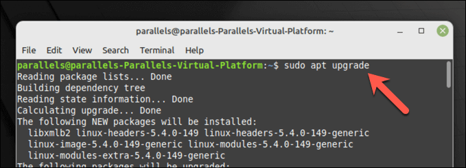 - After the update is complete, type sudo apt upgrade and press Enter. If prompted, confirm by pressing Y and Enter to install any updates.