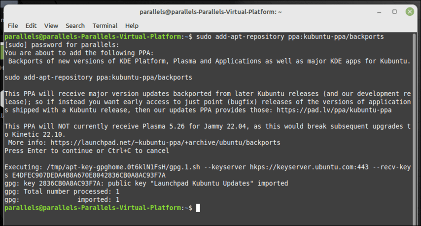 - Type sudo add-apt-repository ppa:kubuntu-ppa/backports and press Enter.