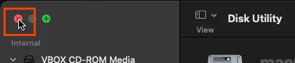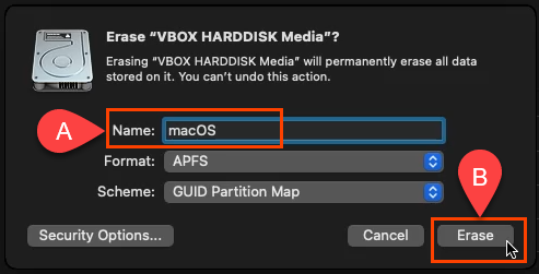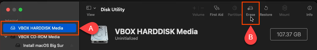 - On the **Disk Utility **screen, select the **VBOX HARDDISK MEDIA **in the left column and select **Erase**.