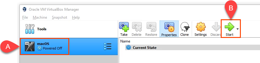 - When the last command finishes, close the Command Prompt and open VirtualBox again. Choose your **macOS** VM and select **Start**.