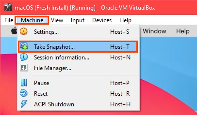 - Once you’ve completed the setup, take a snapshot of the freshly installed state. This allows you to revert back to it easily should something go wrong with the macOS VM in the future.