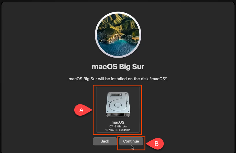 - It asks you to **Continue **again. Then it will ask you to agree to the software license agreement (SLA) twice. Agree if you want to continue. * Select the disk to install macOS Big Sur on. Only your macOS disk should be showing so click on that. Then select **Continue**.