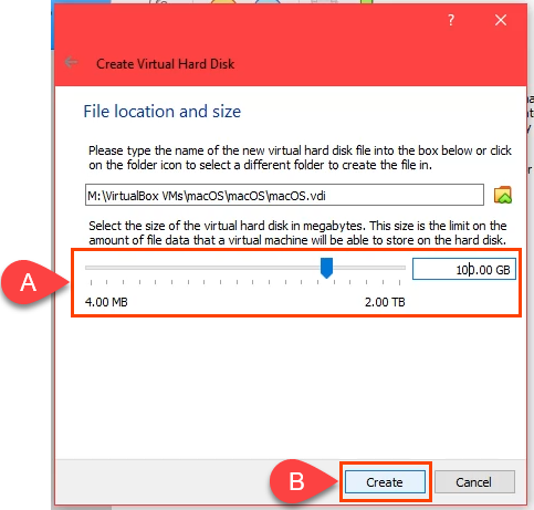 - On the **File location and size** screen, leave the default folder path. Allocate a minimum of 60 GB for the virtual hard disk. If you plan on installing several programs or upgrading the macOS to Monterey, use at least 100 GB. Select **Create **to continue.