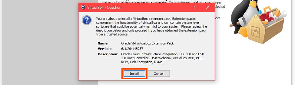 - When the VirtualBox installation is complete, Install the VirtualBox extension pack.