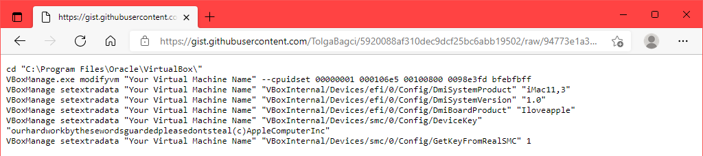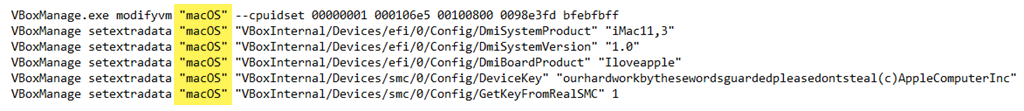 - Go to GitHub and get the VirtualBox macOS codes. Copy them from there and paste them into Notepad. The codes will need to be edited to match your macOS VM situation.