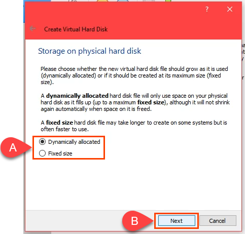 - If you’re creating the macOS on an SSD or nvMe drive, you can select **Dynamically allocated**. SSDs are fast enough to resize without affecting performance much. If you’re not certain, choose **Fixed size**. Select **Next **to continue.