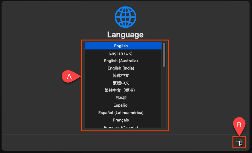 - Next you’ll see the **Language **screen. Choose the language you prefer and select the next arrow to go to the macOS Recovery screen.