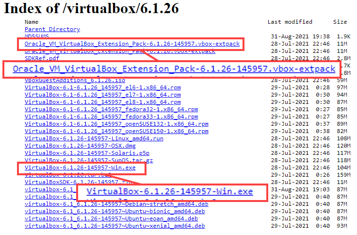 The newest version of VirtualBox that this process appears to work with is VirtualBox v6.1.26. Go to the VirtualBox 6.1.26 download site and select VirtualBox-6.1.26-145957-Win.exe. Also select the VirtualBox Extension pack Oracle_VM_VirtualBox_Extension_Pack-6.1.26-145957.vbox-extpack.