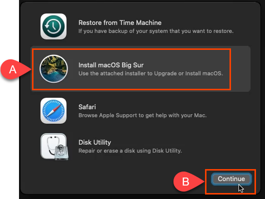 - On the **Recovery **screen, select **Install macOS Big Sur **and then **Continue**.