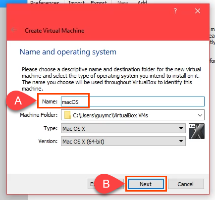 - Enter a name for the virtual machine in the **Name** field. A simple name is easier to work with, like **macOS**. Select where the macOS virtual machine will be installed in the **Machine Folder** field. For a multi-disk PC, pick a disk with at least 100GB of free space. If possible, pick an SSD disk. That will help performance. Or leave it as the default. VirtualBox will automatically set the **Type **to **Mac OS X **and **Version **to **Mac OS X (64-bit) **based on the name entered for the VM.