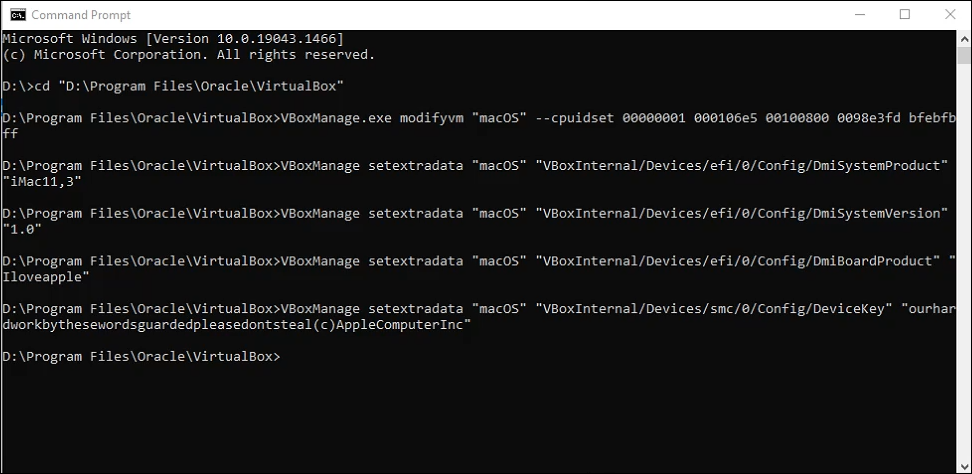- Open the **Command Prompt **as **Administrator**. Copy the first line of code and enter it. This will change the base directory in the Command prompt to where you installed VirtualBox. Then copy, paste, and run each line by itself in the Command prompt.