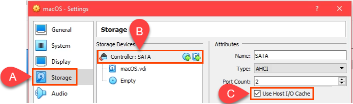 - Go to the **Storage **page. Select **Controller: SATA **and then check the **Use Host I/O Cache **box. Then select the **Empty **storage device.