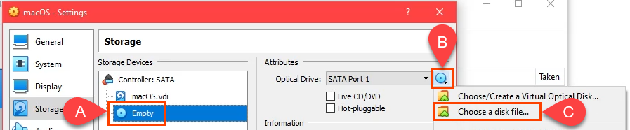 Select the DVD icon next to the **Optical Drive **field. Then select Choose a disk file. Navigate to where you stored the macOS .iso download and select it. Select **OK **to continue.