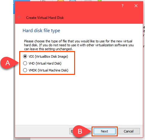 - **VDI (VirtualBox Disk Image)**: Only works in VirtualBox. If you might migrate the VM to another VM host like Hyper-V or VMWare, don’t choose this one. * **VHD (Virtual Hard Disk)**: Good for migrating the VM to Hyper-V. * **VMDK (Virtual Machine Disk)**: Good for migrating the VM to VMWare.