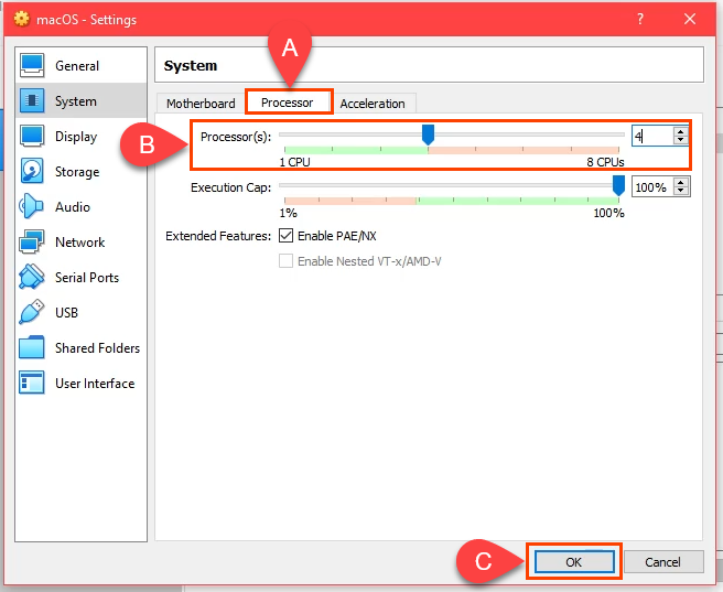 - Move to the **Processor **tab. Adjust **Processor(s) **to at least 2 CPUs. If your CPU has 4 cores and 8 logical processors, VirtualBox will show that you have up to 8 CPUs to use. Don’t use more than half. Leave **Execution Cap **at **100%** and **Enable PAE/NX** should be selected by default as well. Select **OK **to continue.