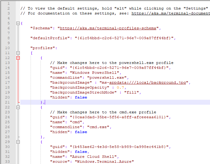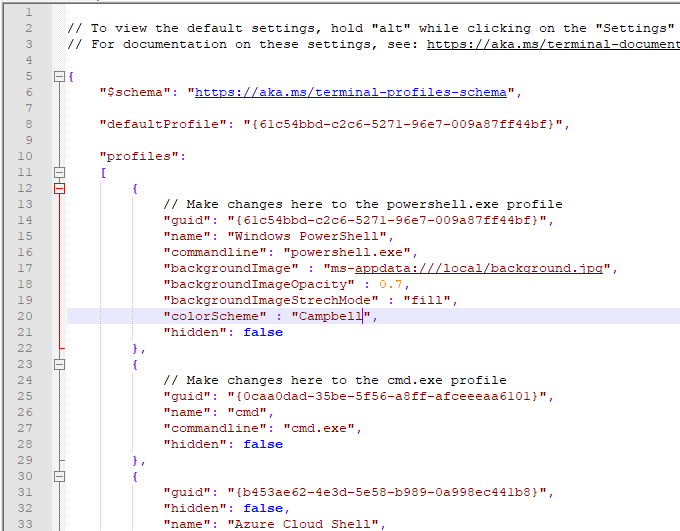 The JSON file has separate “profiles” sections that allow you to edit the profiles for each type of app and terminal shell. If you wanted to change how Windows Terminal looks in a PowerShell app,for instance, look for the PowerShell section. Use the **“name”** or **“commandline”** lines to find each profile.