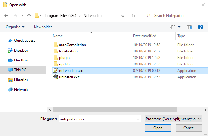 - In the app selection dialog box, head to the default installation location for Notepad++. For most users, this can be found at C:Program Files (x86)Notepad++. Select **Notepad++.exe **then click Open.