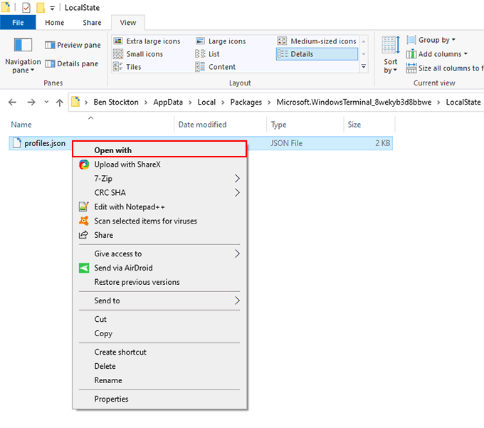 JSON files are a little complicated, but the profiles.json file is pretty easy to work through. With Notepad++ now configured to automatically open JSON files, you can access your settings file within Windows Terminal at any point.