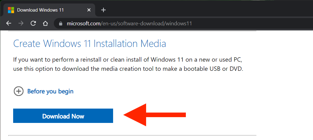 1. Head over to the Download Windows 11 page on Microsoft. Then, scroll down to the Create Windows 11 Installation Media section and select Download Now to get the Media Creation Tool.